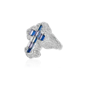 💎 This stunning cross ring features deep blue baguette-cut moissanite diamonds surrounded by micro-pavé lab-grown stones for a bold, luxurious shine.