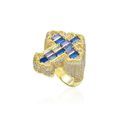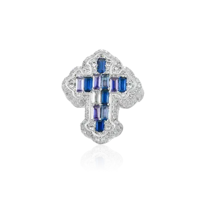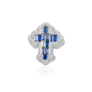 💎 This stunning cross ring features deep blue baguette-cut moissanite diamonds surrounded by micro-pavé lab-grown stones for a bold, luxurious shine.