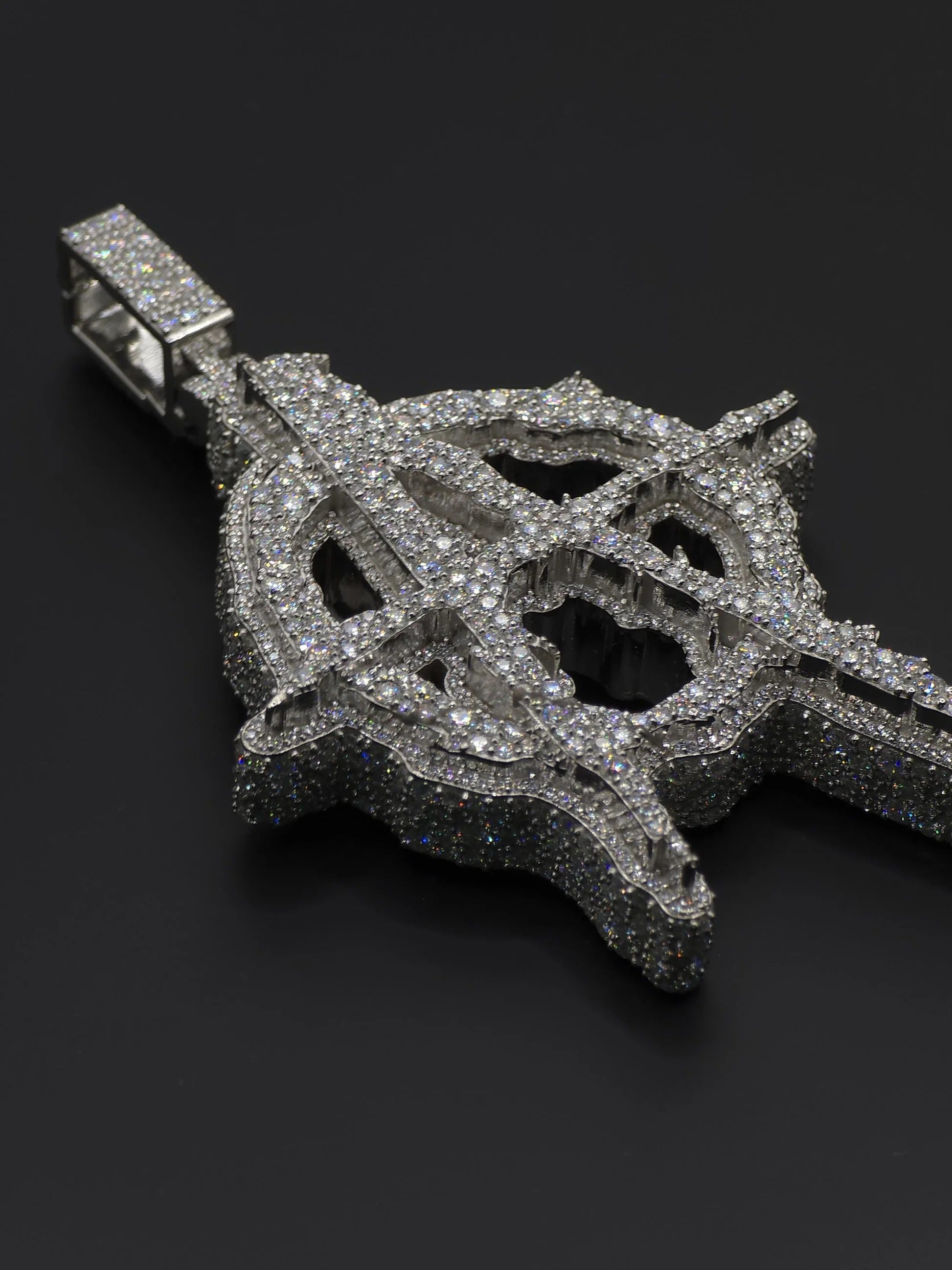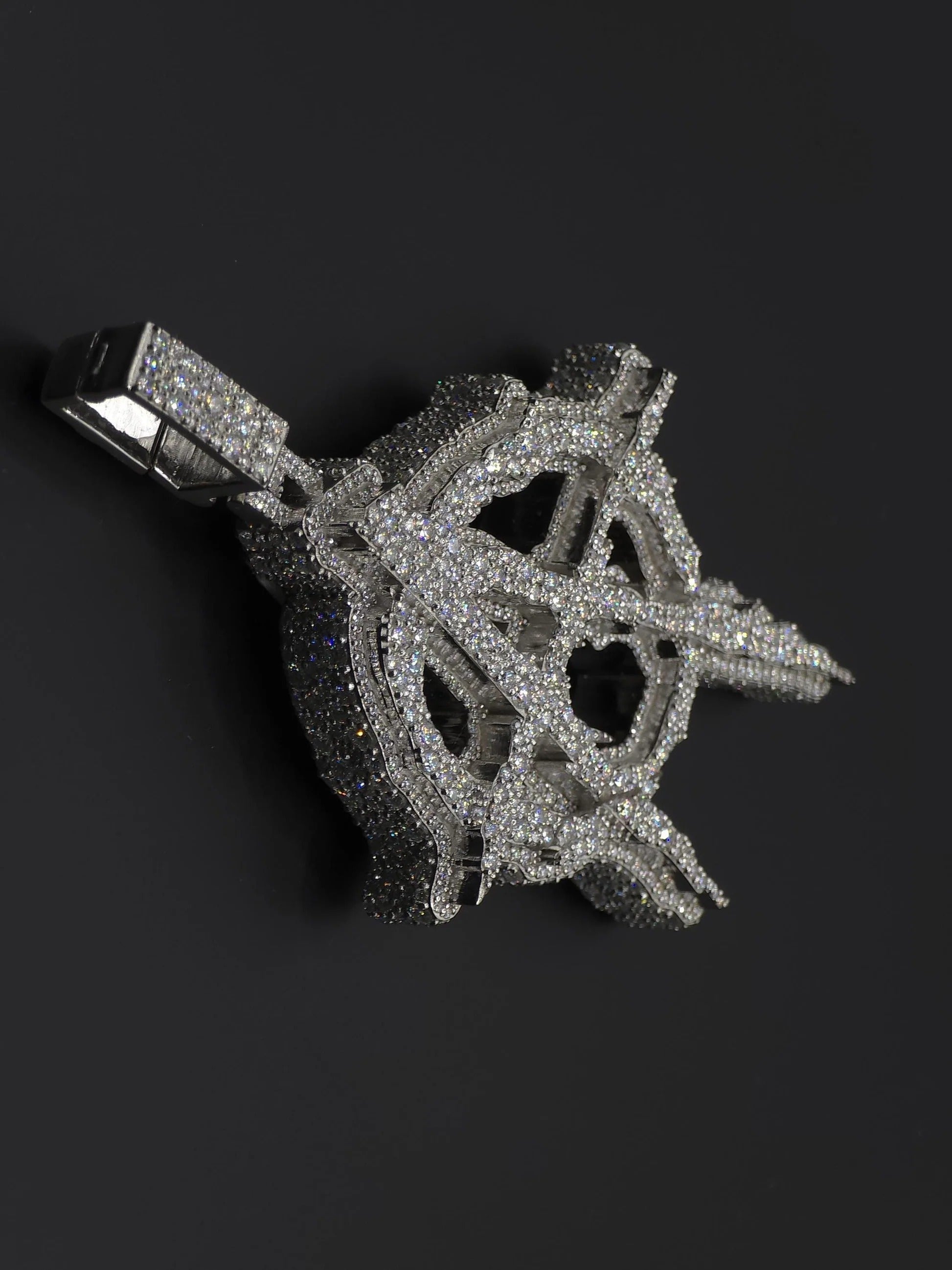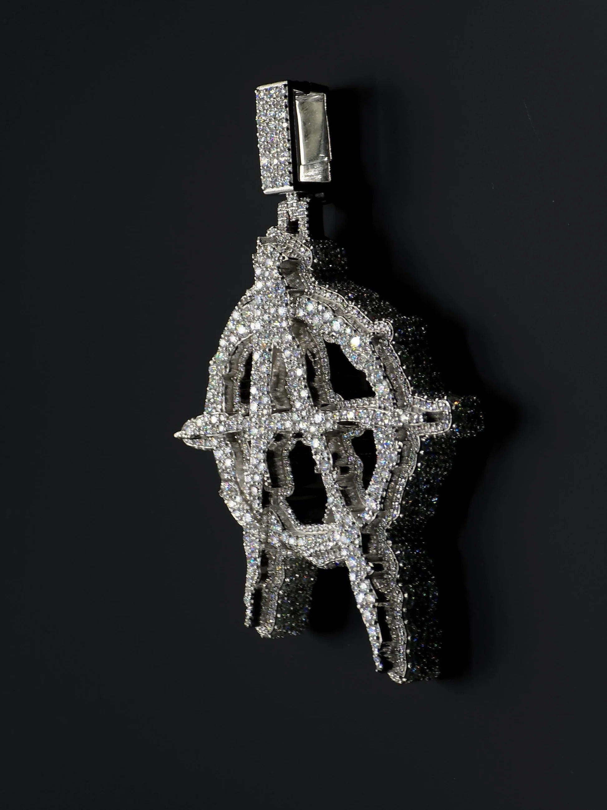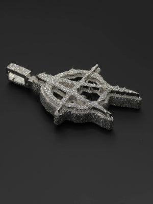 Stand out with this bold Anarchy “A” pendant, crafted in a 3D design and fully iced with round cut stones in a mosaic setting. The intricate detailing and layered depth give this piece a powerful look that makes a true statement in hip hop jewelry.